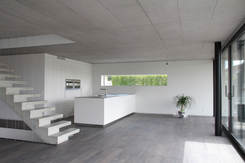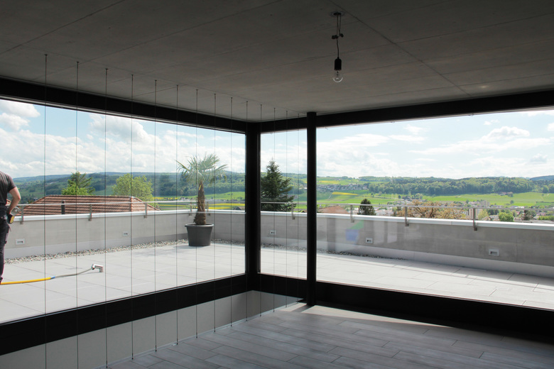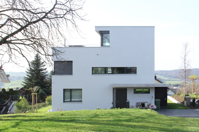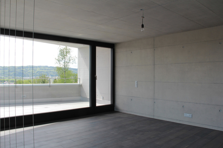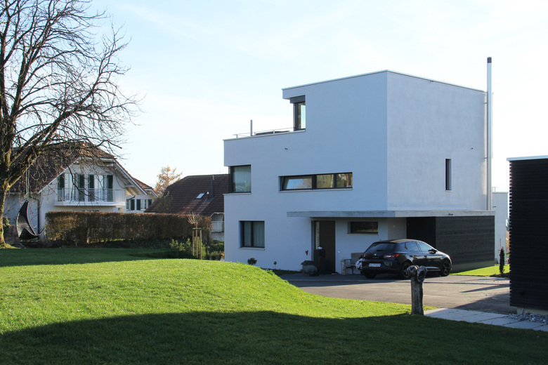 Das Haus ist eines von zwei an einem Westhang gebauten Einfamilienhäusern mit Attika. Die schmale senkrecht zum Hang liegende Parzelle gab Anlass, den Grundriss beinahe quadratisch in die Höhe zu entwickeln.