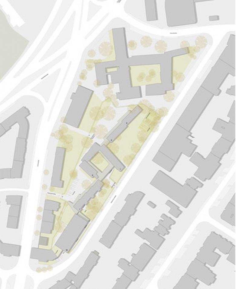 Das denkmalgeschützte Ensemble der Grundschule wird um einen präzisen Körper erweitert. Entsprechend dem Leitbild „raumbildendes Solitärensemble im Grünraum“ setzt die bauliche Konzeption in direkter Beziehung zu den bestehenden Gebäuden die vorgefundenen Strukturen fort und interpretiert sie neu. Der klare und einfache Baukörper bildet mit den denkmalgeschützten Altbauten und Grünflächen als Ensemble eine bauliche Einheit und bindet es fest in das städtische Umfeld ein. Das grüne Vorfeld der Schule zur Robert-Koch-Straße wird von Bebauung freigehalten, weiter entwickelt und um eine Schulterrasse ergänzt. Die bestehenden, internen Laubengänge finden ihre Fortsetzung in der Erschließung und Anbindung des Neubaus. Die verschiedenen Baukörper der bestehenden und neuen Schulgebäude verbinden sich über die Freiflächen zu einer formalen und räumlich-funktionalen Einheit und werden so in das Wegenetz auf dem Schulareal eingebunden. Die gelbe Steinfassade der denkmalgeschützten Schulgebäude wird, den Neubau umkleidend, fortgeführt. Auf diese Weise wird der Neubau mit den Altbauten der Schule eindeutig zu einer räumlichen, formalen und funktionalen Einheit verbunden.
