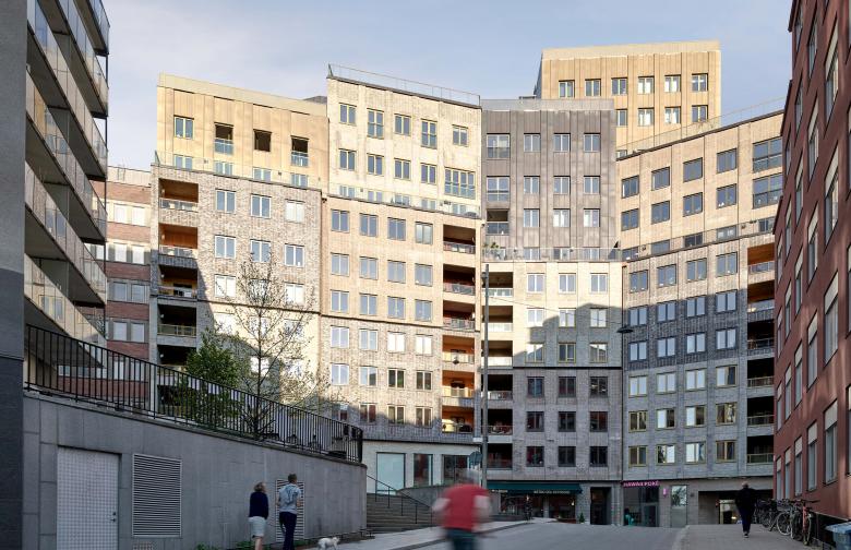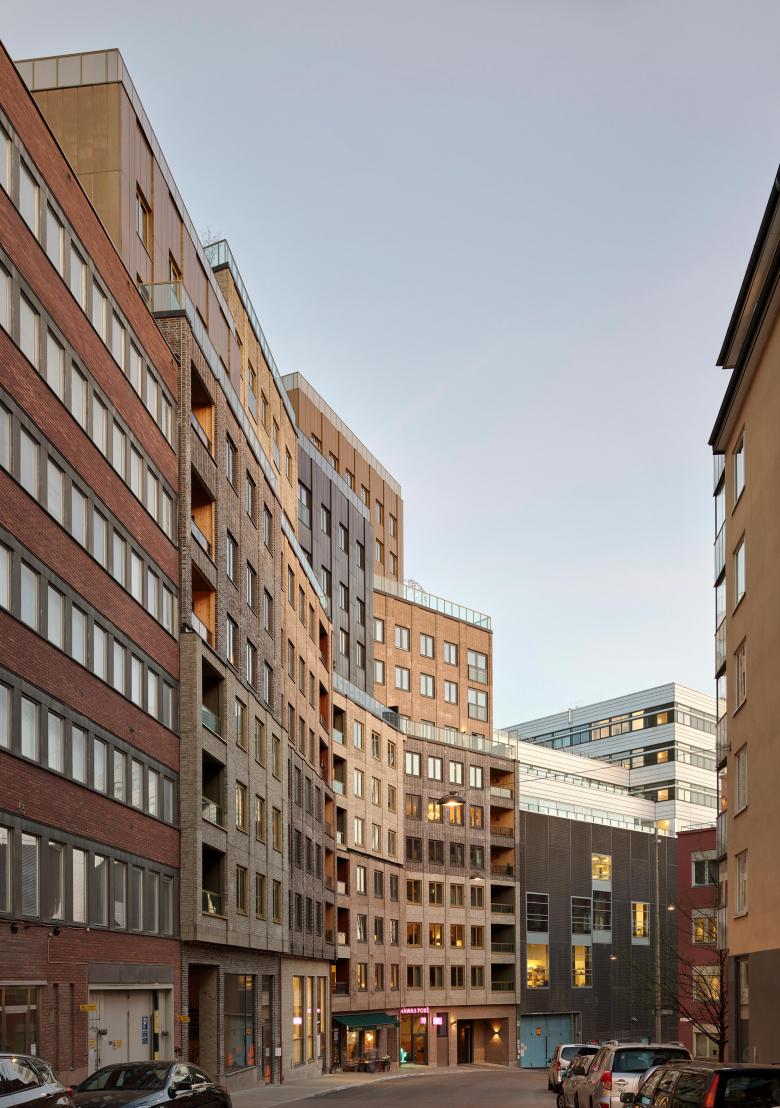 The architectural expression refers to a classical order found in the inner city of Stockholm – an open base with commercial spaces, a main body with housing and a top with set-back penthouses. A rich mix of materials offer lightness and variety. The facade combines three types of brick with metal sheets, and niched terraces clad in timber. The apartments are designed in a bright lofts style of varying sizes.