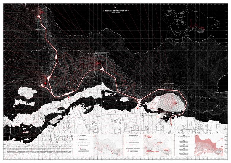 "A new cemetery is proposed in La Palma, located over the new lava landscape and linked to the sites of the old cemetery of Las Manchas and the former Church of Todoque, now buried beneath 20 meters of solidified lava and a superficial layer of slag.