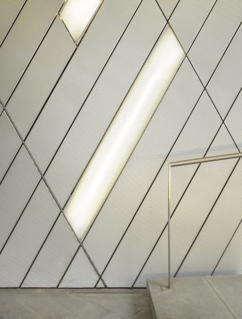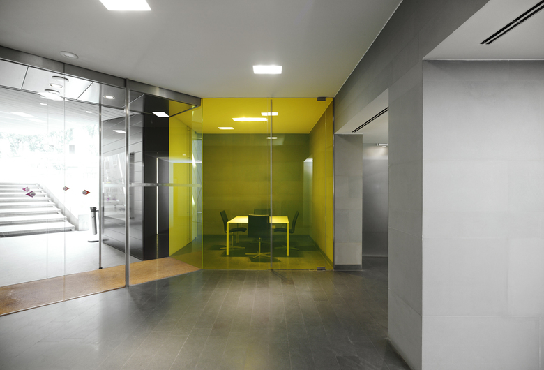 The renovation project for the common areas of the 1950s-built Palazzo Generali in via Tiziano in Milan has involved moving the building’s entrance to the basement in order to redistribute previously unused spaces and to give the whole complex a new image. This solution led to the construction of a new entrance canopy in concrete, steel and glass that could upgrade the image of the building and the garden, now surrounded by an almost invisible glass-paned fence. This simple but markedly modern design redefines the structure’s relationship with the city. The new canopy, covered in a skin of alternating aluminium and expanded metal panels, appears to be cut out of the surrounding lawn. It provides access to the new entrance hall in the basement thus allowing for recuperation and reuse of the first floor as office space. The façades have also been redesigned by introducing metal mesh foils running vertically down the building to create a three-dimensional effect and a large yellow window pane in the form of giant screen on the same axis as the new “roof”. The project is completed with the transformation of the attic on the top floor into new work spaces and the creation of a new roof for the whole building.
