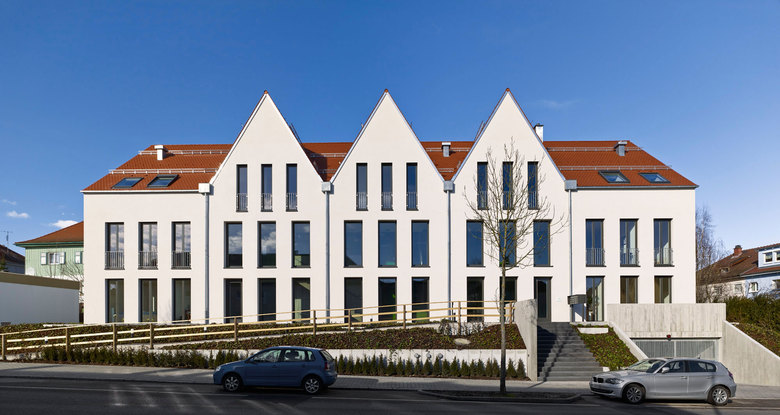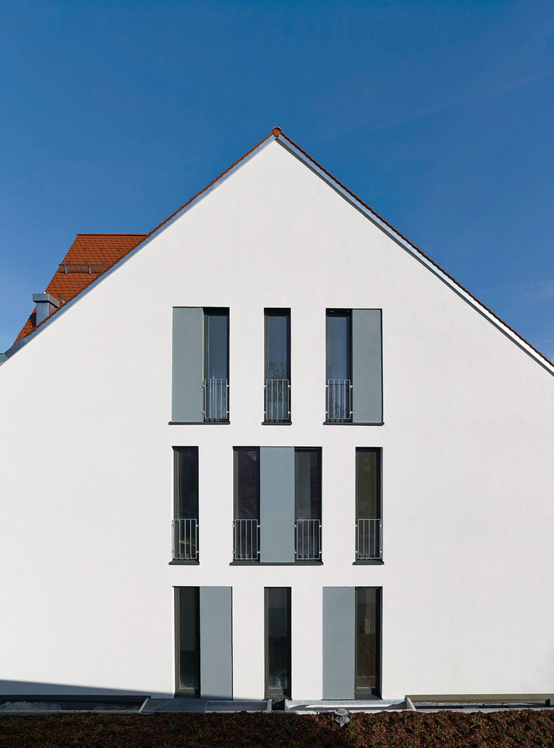 Das Wechselspiel mit der gefalteten Dachform ist markant und bezeichnend für den zentralen Teil der Gartenstadt Arlinger. Auf zwei Wohnebenen plus Dach sind insgesamt 12 Wohnungen unterschiedlichen Zuschnitts angelegt. Die Grundrisstypologie lässt eine Varianz zu, die der Neubau sich zu eigen macht. Alle Wohnungen sind hell und tageslichtdurchflutet. Die französischen Fenster in Verbindung mit Loggien und/oder Balkonen führen zu einem spezifischen Charakter, der sich in der zurückhaltenden Form- und Materialwahl zudem ausdrückt.