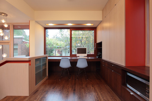 The new addition houses a bright open sunroom, homework area and rear entry at the ground floor, a bathroom and an intimate deck off the master bedroom at the second floor, and a cheerful mudroom at the basement level. Access to the sunroom is via an airy and colourful open stairwell, bathed in natural light. The focal point of the stair and sunroom is a sculpted custom wood cabinet with integral handrail.