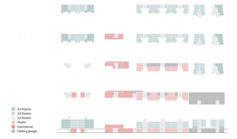 The current station building will also be given a new relationship to the street and, in the long term, will be replaced by a new building after the railroad infrastructure has been moved to the north. This will make possible a completely new, concise urban planning situation. The terrain shift from the track level to the new street level is accompanied by a retaining wall, which becomes part of the archaeology of the site. In part, the buildings stand in front of it, elsewhere the wall becomes its base. The terraced topography becomes the theme of the site.