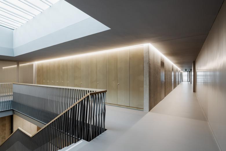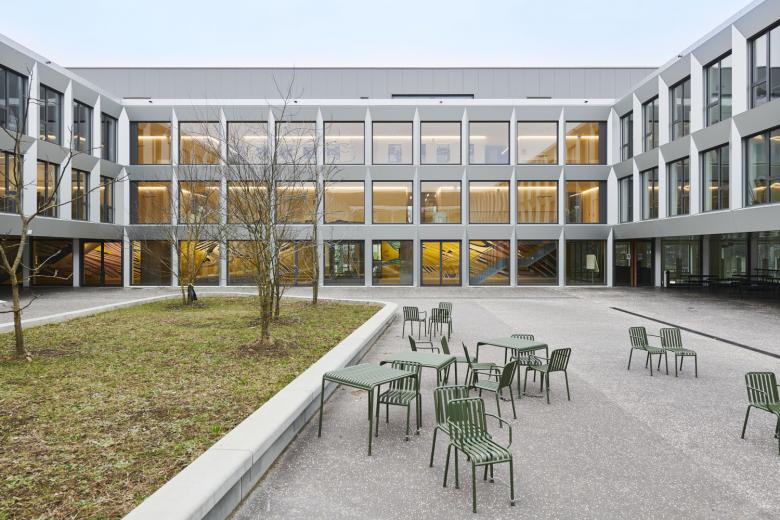 Le nouveau centre de formation réunit sous un même toit la formation cantonale lycéenne et professionnelle. Certaines parties du bâtiment précédent, datant des années 70 et 80, ont été harmonieusement intégrées au nouveau projet, notamment l'aile sportive adjacente. Pour la salle polyvalente de l'aile sportive, les architectes ont choisi une combinaison de béton apparent et de plaques de bois-ciment Duripanel.