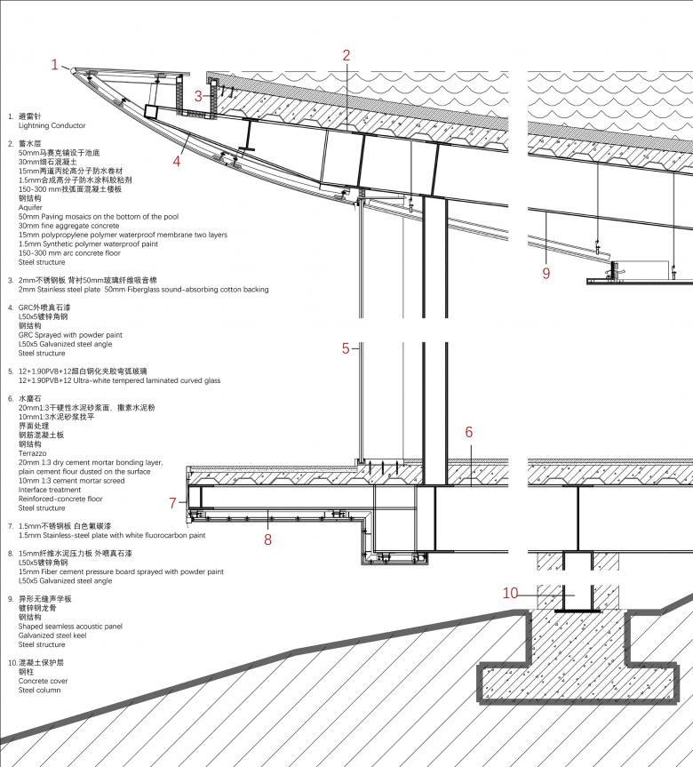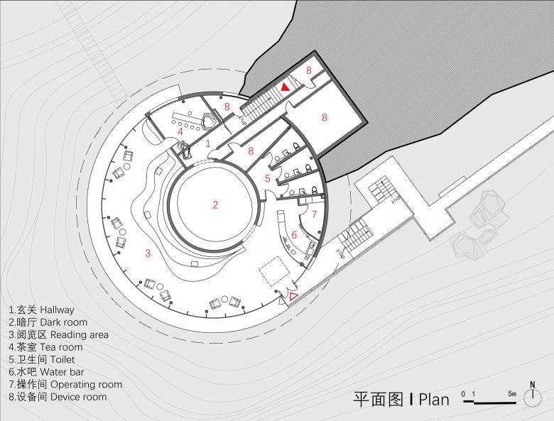 The roof section is bowl shaped, and the transparent glass in the reading area endows the roof with a sense of suspension. The space in the bowl is a pool, below which the main building is located. People go down the corridor and "dive in" from under the pool. The interior is composed of a group of dramatic spaces with a sense of sequence, light and dark, opening and closing overlapping. From the porch to the circular dark space in the middle of the building, and further to the bright and transparent reading area in the outer ring of the building, as well as the simple tea room and mysterious toilet area, readers read the architecture, environment and themselves in different ways.