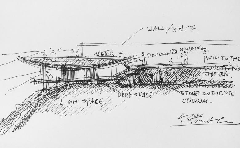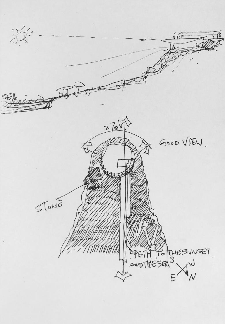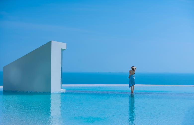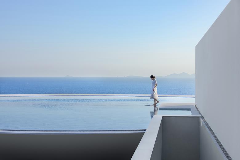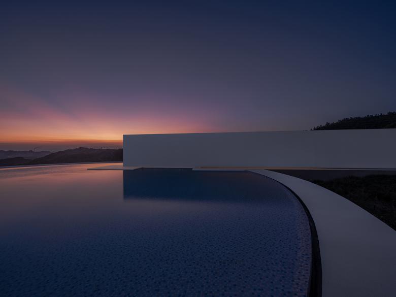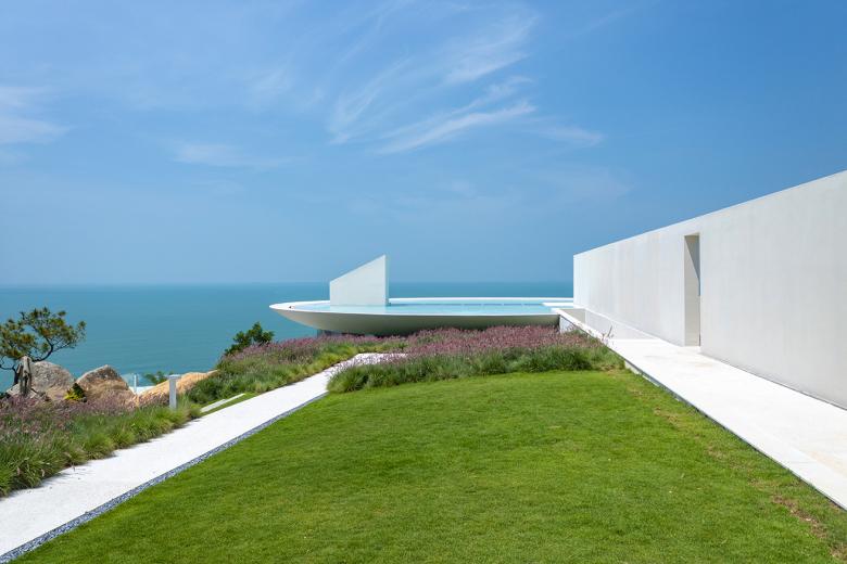 Several boulders in the site are carefully preserved and become an important part of the landscape. The long wall leads people to the roof pool and the sea. The roof pool is more or less utopian — people can enter the pool and walk on the water, their sight skimming over the water and viewing the sea level in the distance. Water, sky and sea are integrated here and now.