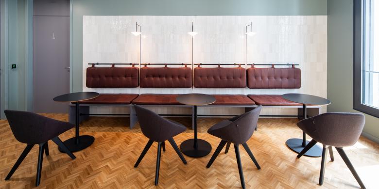Bewusst verfolgte das Projektteam von CSMM das Ziel, die für Europa entwickelte Identität am neuen Standort weiterzuentwickeln und so einen starken Wiedererkennungswert zu schaffen. Die Flächenfunktionen und Gestaltungselemente aus Hamburg wurden Grundlage für das neue Design und an die räumlichen Gegebenheiten in Frankfurt angepasst: Das neue Büro von Addleshaw Goddard in Frankfurt am Main befindet sich in einem architektonisch spannenden Gebäude, dessen ungewöhnlich spitz zulaufende Form die Innenarchitektur vor besondere Herausforderungen stellte: Die Räumlichkeiten boten keine geraden Winkel, und es bedurfte maßgeschneiderter Einbauten, um sie optimal zu nutzen. Hier setzte das Planungsteam auf individualisierte Schreinerarbeiten für die Möbelausstattung.