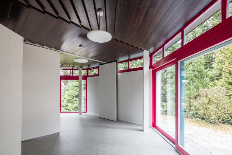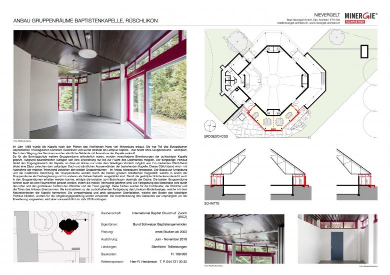 Da für die Sonntagschule weitere Gruppenräume erforderlich waren, wurden verschiedene Erweiterungen der achteckigen Kapelle geprüft. Aufgrund baurechtlicher Auflagen war eine Erweiterung nur bis zur Flucht des Dachrandes möglich. Der bergseitige Portikus bildet den Eingangsbereich der Kapelle, so dass ein Anbau nur unter dem talseitigen Vordach möglich war. Ein markantes Oblichtband bildet eine Zäsur zwischen dem zeltartigen Dach und sämtlichen Aussenwänden der bestehenden Kapelle. Dieses Oblichtband wird - mit Ausnahme der mobilen Trennwand zwischen den beiden Gruppenräumen – im Anbau konsequent fortgesetzt. Der Bezug zur Umgebung und die zusätzliche Belichtung der Gruppenräume werden durch die beiden grossen Glasflächen hergestellt, welche in einem der Gruppenräume als Festverglasung und im anderen als Hebeschiebetür ausgebildet sind. Damit die gestülpte Holzdeckenuntersicht auch in den Gruppenräumen erhalten werden konnte, erfolgte die Isolation zum Estrichraum oberhalb der Decke. Die beiden Gruppenräume können auch als eine Raumeinheit genutzt werden, indem die mobile Trennwand geöffnet wird. Die Farbgebung des Bestandes wird durch den roten und den grünblauen Farbton der Oblichter und der Türen geprägt. Diese Farben wurden für die Holzfenster, die Oblichter und die Türen des Anbaus übernommen. Sie kontrastieren zu der zurückhaltenden Farbgebung des Linoleum-Bodenbealges, welche mit dem Natursteinboden der Kapelle harmoniert. Die unregelmässig und grob gehauenen Granitplatten, welche den Boden des talseitigen Portikus bildeten, wurden für die Umgebungsgestaltung wieder verwendet. Die Inventarisierung des Gebäudes war ursprünglich vor der Erweiterung vorgesehen, wird aber voraussichtlich im Jahr 2018 vollzogen.