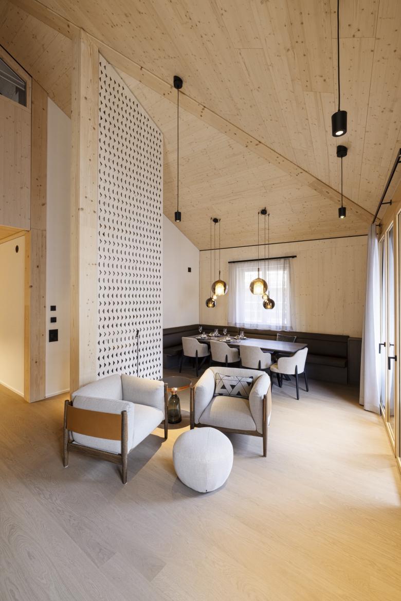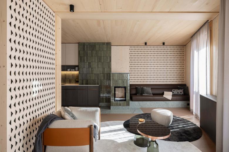 Das Projekt ist als hochwertiger Holzbau mit einem hohen Anteil an Wohnungen im gehobenen Segment konzipiert. Es fügt sich harmonisch in das verdichtete bauliche Umfeld ein und erfüllt zugleich höchste Ansprüche an Komfort und Ästhetik. Abstrahierte Sgraffito-Muster, die aussen Anwendung finden, schaffen eine Verbindung der lokalen Tradition und Moderne.