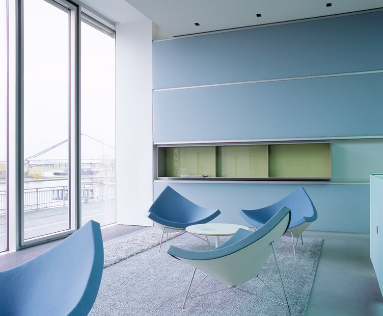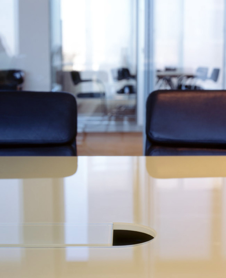Mit High-Tech-Stoffen bespannte Möbelfronten und Wände stehen im Kontrast zu den ansonsten eher glatten Wandoberflächen und schaffen neben akustischem Komfort auch einen ungewohnten optischen und haptischen Reiz. Medientechnik, die nur bei Gebrauch sichtbar wird, und die praktikable Integration von Organisationsschienen für Charts in eben jene Wandbespannungen halten die Konferenz- und Besprechungsräume frei vom typischen "Arbeitszubehör".