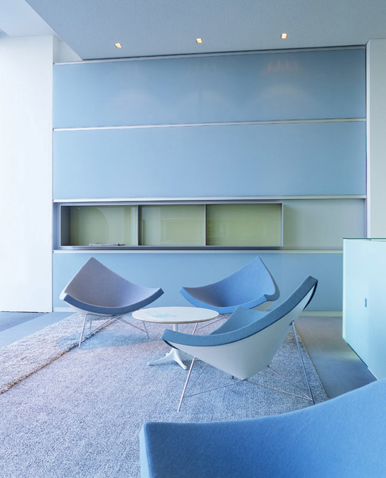 Die hellen, lichten Wand- und Deckenfarbtöne in einer Skala von Weiß bis Aquamarin und die gläsernen Flurwände, führen das Grundprofil der Transparenz in der Farbstimmung der äußeren Umgebung - des Wassers und des Himmels - im Innenbereich weiter.