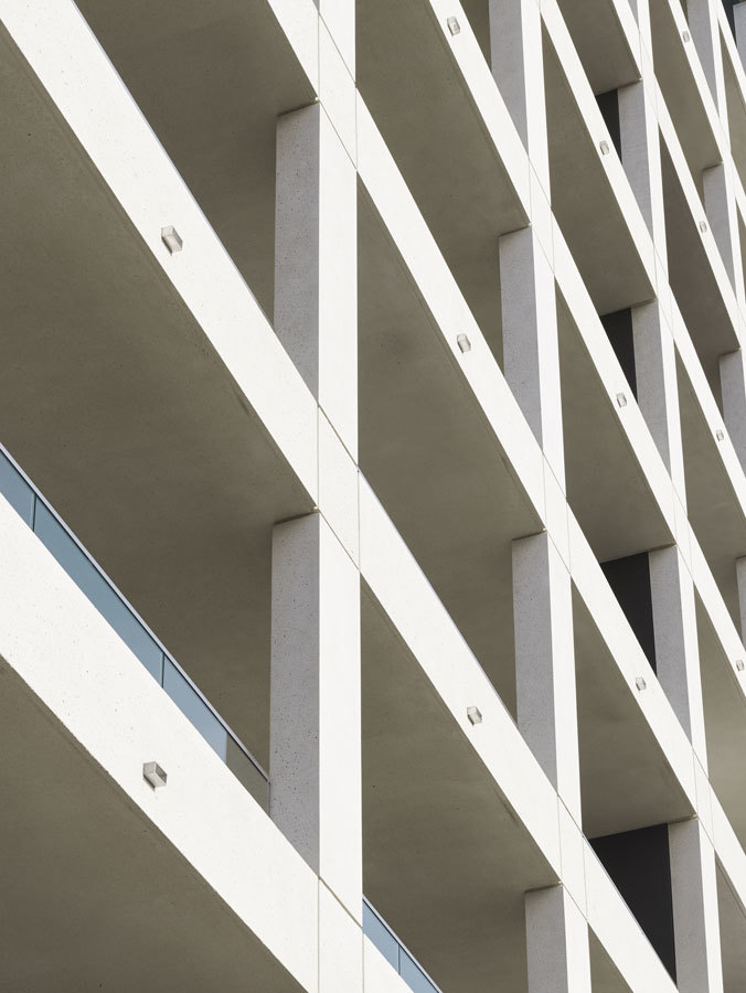 Entwurf – Zentraler Baustein des Entwurfskonzeptes ist eine neue hochgedämmte hinterlüftete Gebäudehülle und die Schaffung großzügiger überdachter privater Freiräume jeweils als Betonfertigteilkonstruktion. Die neue Gebäudehülle trägt zum einen zu einer deutlichen Wohnkomfortsteigerung für die Bewohner bei (Schall-, Sonnen- und Wärmeschutz), zum anderen wird das Stadtbild nachhaltig aufgewertet. Den oberen bislang undefinierten Gebäudeabschluss bilden zwei neue Dachgeschoss-Loft-Wohnungen. Durch diese baukörperliche Ergänzung werden auch die Gebäudeproportionen wahrnehmbar verbessert.