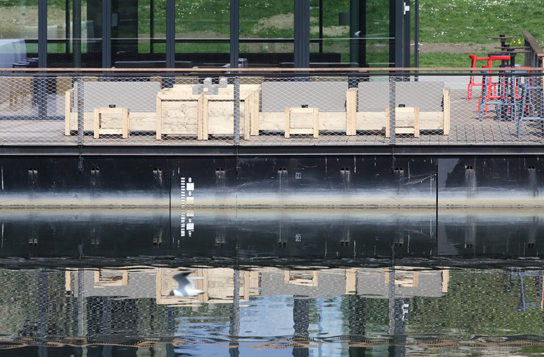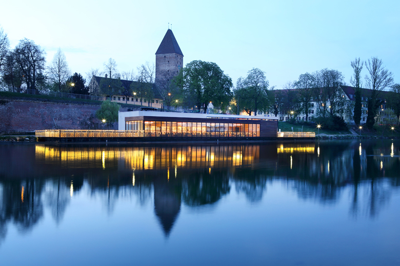 Das am Ulmer Donauufer nahe der historischen Stadtmauer gelegene schwimmende Gebäude gliedert sich in zwei Baukörper, die sich in Längsrichtung und Höhe zueinander verschieben. Diese Verschränkung bleibt im Innenraum spürbar und definiert gleichzeitig die unterschiedlichen Restaurantbereiche, den Barraum und den Gastraum. Komplett öffenbare Glasfassaden bieten einen fließenden Übergang auf die angrenzenden Terrassen, Außen- und Innenbereich verschwimmen miteinander. Eine aufwendige Pontonkonstruktion ermöglicht den Betrieb bei nahezu allen Wasserständen. Das Restaurant bietet auf gesamt 335m² Gastraumfläche, sowie den großzügigen Terrassen Platz für ca. 300 Gäste. Für Küche, Lager und Personalbereiche stehen 110m² zur Verfügung, die Technikbereiche sind in einer Zwischenebene untergebracht.