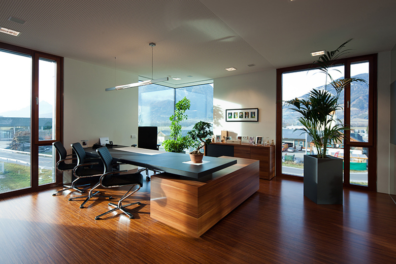 Das monolithische Gebäude lebt vom Wechselspiel der horizontalen Geländekante - verstärkt durch die Winkelstützmauer - und dem diese vertikal durchstoßenden dreigeschossigen Baukörper. Er beinhaltet Büro-, Seminar-, Schulungs- und Besprechungräume, Kopier- und Personalräume, Archiv, Lager sowie entsprechende Technikräume. Mit der individuell gestalteten Büroeinrichtung wird die Form des Gebäudes im Inneren in formaler und funktionaler Hinsicht weitergeführt. Die Beleuchtung ist integrativer Bestandteil der Innenarchitektur. Der umweltbewusste Umgang des Bauherrn mit Ressourcen kam auch bei der Errichtung dieses Objekts zum Tragen: in ökologischer Hinsicht unterbietet das neue Büro- und Verwaltungsgebäude geltende Niedrigenergiestandards.