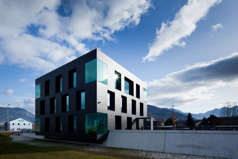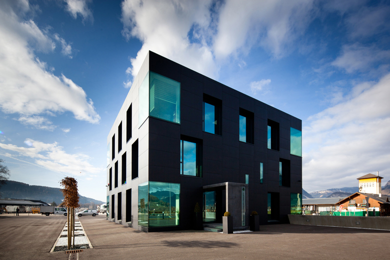 Das neue Büro- und Verwaltungsgebäude der H. Junger Bau Gmbh, eine seit Jahren aufstrebende und ständig expandierende Spezialfirma für Tunnel- und Brückenbau sowie Abdichtung, Schutz und Instandsetzung von Betonbauteilen, stellt durch Form- und Farbgebung einen direkten Bezug zur Firmenidentität dar. Die anthrazitgraue vorgehängte Eternit-Fassade repräsentiert den Werkstoff Beton, die raumhohen grünen Fenster stehen für die umweltbewusste Tätigkeit des Unternehmens.