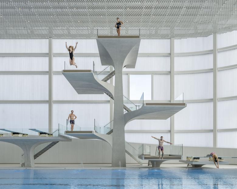 Le regroupement des activités sportives – patinoires, piscines escrime ettennis de table – est animé par un souci d’économie en mutualisant les accès, coûts d’exploitation et infrastructures (p.ex. chauffage de la piscine par chaleur résiduelle de la production de froid). La polyvalence est aussi privilégiée, notamment la patinoire convertible en grande salle de spectacle. Les installations sportives (locaux, distributions, sécurité, climat, éclairage, médias…) ont été conçues en détail avec les utilisateurs, en particulier pour optimiser les installations (froid et chauffage, ventilation, électricité…). Rationnel, le dessin des circulations séquence aussi le parcours en plaçant des accents comme le grand escalier circulaire ou les vues plongeantes sur la piste de glace. Les courbes illustrent les rayons de giration des véhicules, tandis que les concavités abritent les entrées.