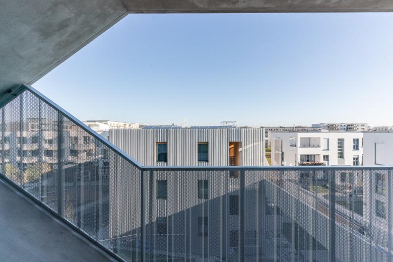 Die Hexagonalstruktur erlaubt intelligente, räumliche Verschachtelungen und ermöglicht unzählige Kombinationsmöglichkeiten von Raumeinheiten: Es gibt 22 Einheiten zwischen 22 und 106 Quadratmetern, darunter Maisonetten mit 1 bis 4 Zimmern, aber auch einzelne Wabenzimmer mit eigenem Bad, die über das gesamte Haus verteilt sind. Beim WG-Modell steht den Bewohner*innen ein Gemeinschaftsraum mit Küche zur Verfügung, der zugleich als Ess- und Wohnzimmer dient. Hinzu kommen weitere Gemeinschaftsräume, eine Fahrradwerkstatt, ein Quartiersladen, ein Gästeappartement und eine gemeinschaftlich nutzbare Dachterrasse. Das Konzept gemeinsamer Wohnräume fungiert als zentraler Knotenpunkt und fördert Gemeinschaftskultur und gemeinsame Wohnerlebnisse.