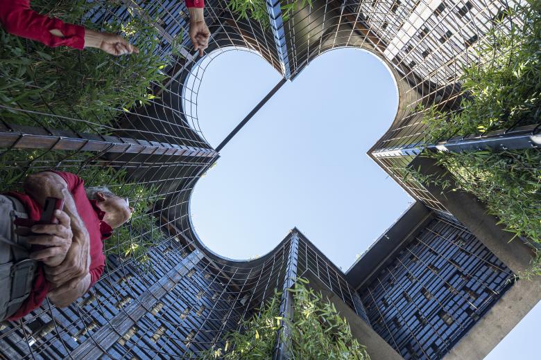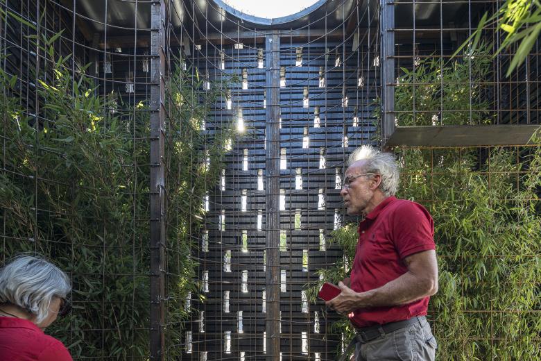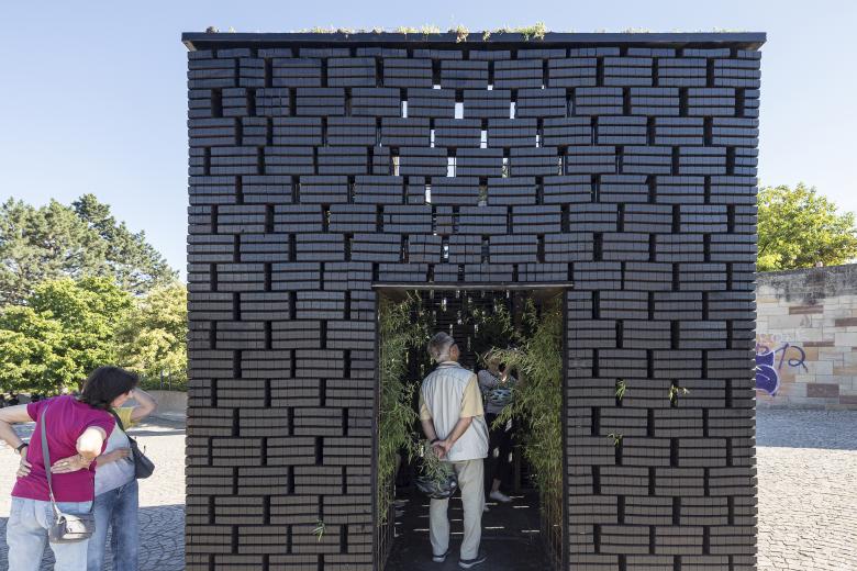 One of the Reflecting Points, called Coal Museum, located at Friedrichsplatz, served as a place of encounter and reflection, featuring sitting niches within its structure. The form of the green landscape park of the nearby Karlswiese has symbolically been stamped out of a black block. Coal briquets and plants defined the building and were the main exhibition elements of this small museum. Its key message was clear: “We must place coal into the museum now; we cannot wait until 2038. Let us harness the regenerative power of soil and plants.” This vision was expressed through the image of bamboo breaking through the gaps of the coal cube, symbolizing nature’s capacity to replace fossil fuels with regenerative alternatives.