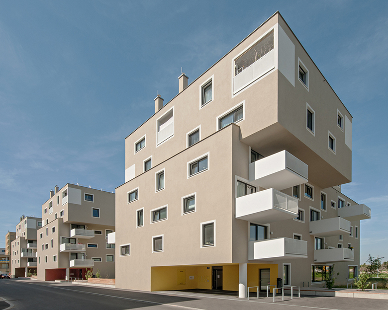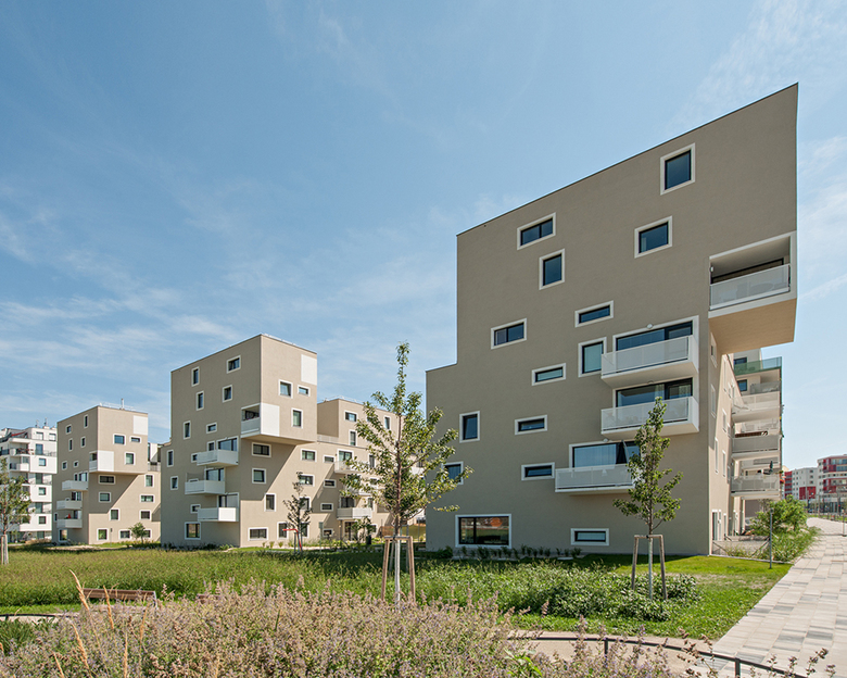 Unterschiedliche Wohnungstypen mit jeweils speziellen, zugeordneten Freiräumen werden zu einer neuen Typologie gestapelt. Allen Wohnungen ist eine individuelle Freifläche zugeordnet.