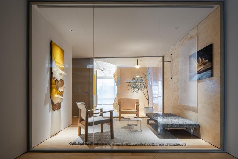 Beside the reception area, there lies a relatively private resting area, which features simple structures but a distinctive image. The hanging leather artworks are inspired by the Shaanxi shadow puppetry and are made of ECCO's leather materials. This small-scale space shows a modern aesthetic, and highlights the integration of Xi'an and Danish cultures.
