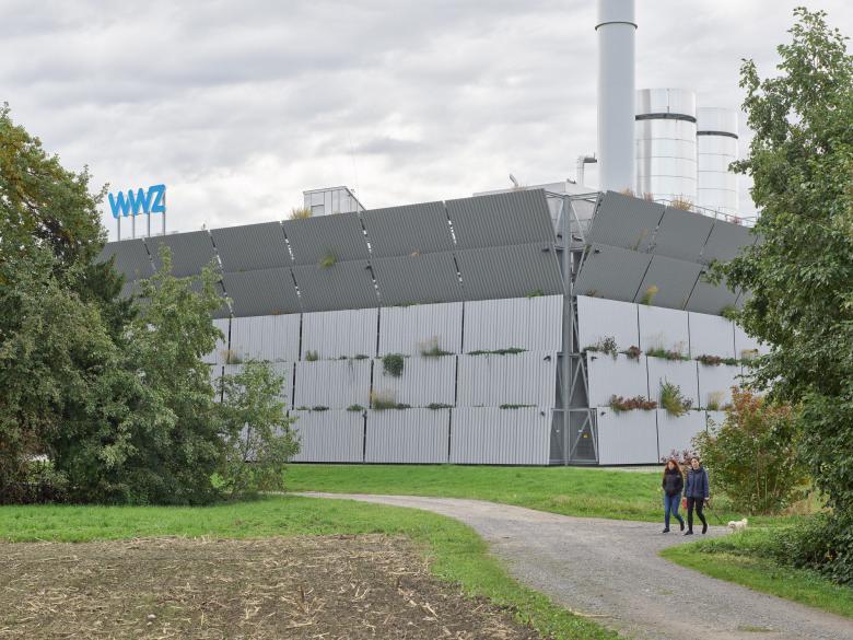 La centrale énergétique Unterfeld à Zoug est le cœur de l’approvisionnement énergétique local et fournit chaleur et froid à un nouveau quartier en cours de construction. L’eau provenant du lac de Zoug en est la source d’énergie principale. Dans la centrale énergétique, des pompes à chaleur amènent l’énergie thermique extraite de l’eau du lac à des températures utilisables, afin de la distribuer ensuite aux bâtiments du quartier. La nouvelle centrale énergétique se trouve à la jonction entre une zone résidentielle et une zone protégée. La ville de Zoug interdisant la construction d’un bâtiment industriel dans un espace naturel protégé, le fournisseur d’énergie a choisi d’organiser un concours pour la conception de la façade. Les architectes zurichois Lütjens Padmanabhan ainsi que l’entreprise Bischoff Landschaftsarchitektur l’ont remporté, avec leur idée d’un jardin vertical.