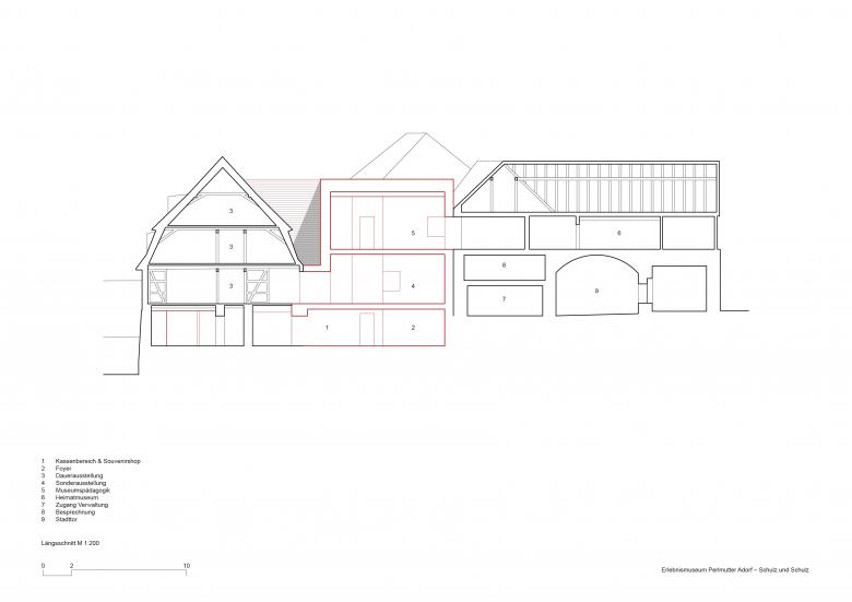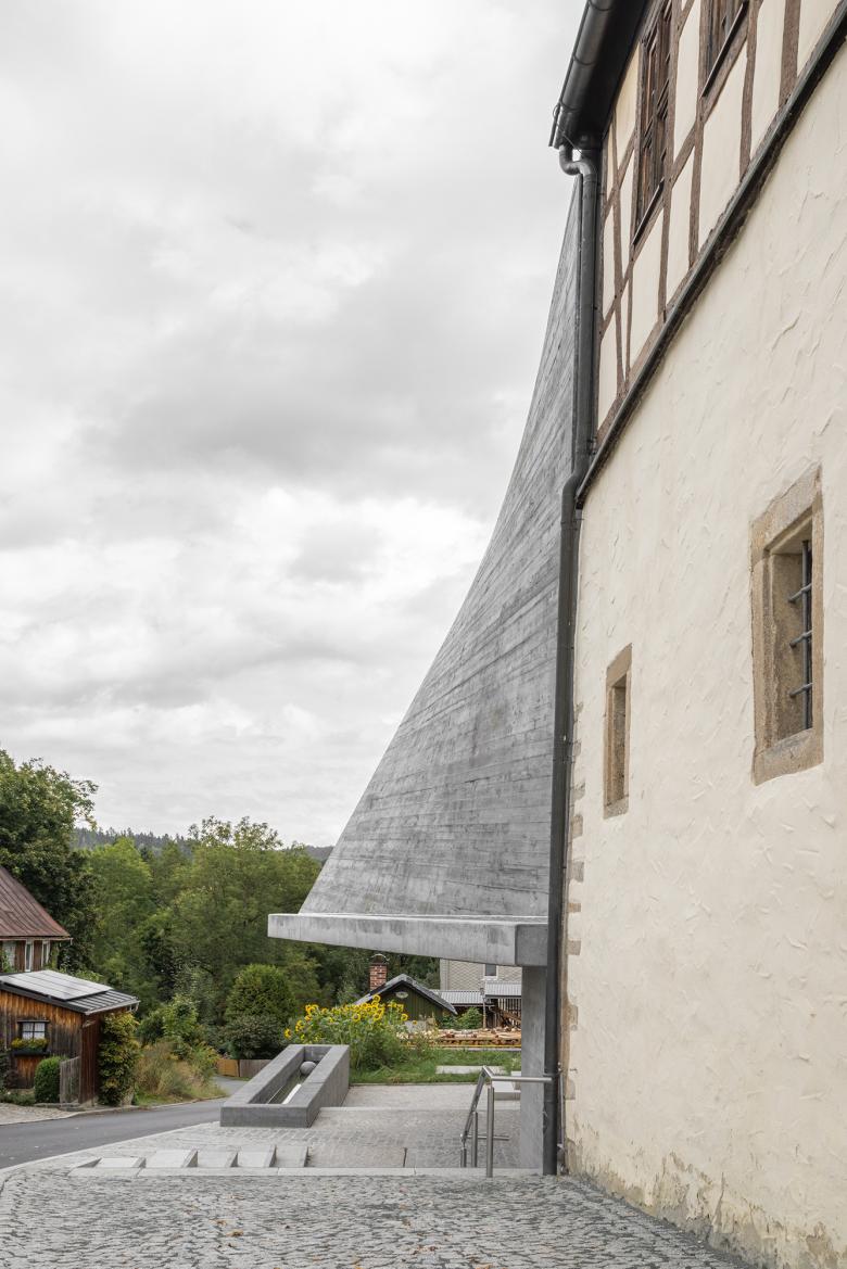 Das neue Eingangsgebäude mit der Betonschale verbindet zwei historische Fachwerkhäuser