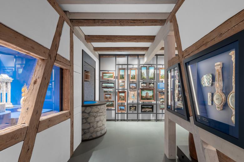 Die Ausstellung fügt sich in das historische und ergänzte Fachwerk des Altbaus ein