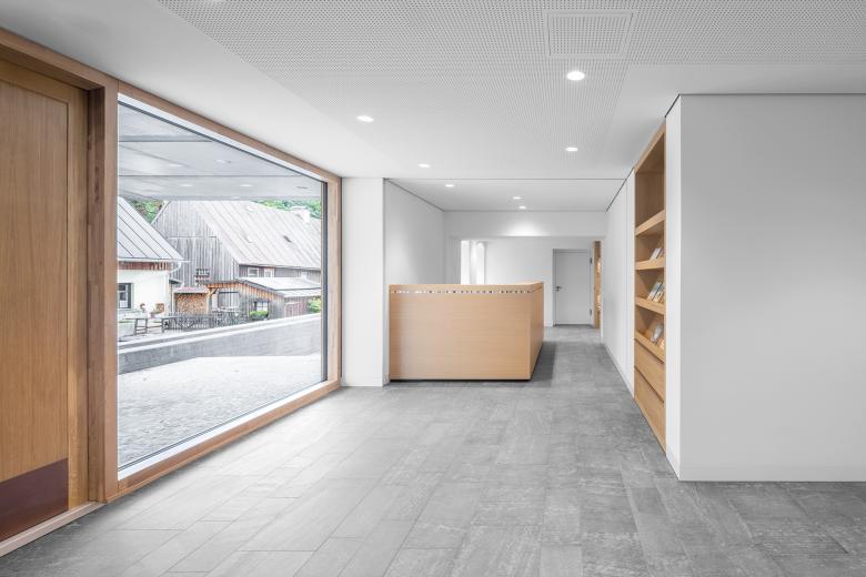 Die Altbauten, die rund vier Fünftel der Gesamtfläche ausmachen, werden durch die Verbindung mit dem Neubau erhalten und langfristig sinnvoll weitergenutzt. Der Neubau hat keinen Keller, um den Einsatz von Beton zu reduzieren. Die Räume der Gebäudetechnik befinden sich in einem der angrenzenden Altbauten. Die gekrümmte Fassade besteht aus einer materialminierten Beton-Hyparschale. Die Tragkonstruktion im Bestand wird mit Vollholz aus heimischen Wäldern verstärkt, ebenso werden für Fenster und Möbel heimische Hölzer verwendet.