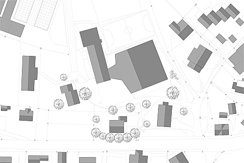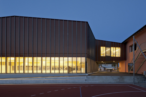 Die Sporthalle wird als Ersatzbau für die alte Einfachturnhalle konzipiert und bildet zusammen mit dem Schulhaus ein neues Gebäudepaar, bestehend aus zwei eigenständigen und miteinander verbundenen Einheiten, die den Pausenplatz neu fassen. Der Neubau führt allerdings zu einem bedeutenden Massstabsprung, den es im Kontext des Dorfbildes zu kontrollieren gilt. Die Setzung des Hallenbodens auf der Höhe des bestehenden Untergeschosses ermöglicht eine innere Verbindung zwischen Schule und Sporthalle. Das Erdgeschoss wird somit freigespielt: ein neues Aussichtsfenster in die Landschaft öffnet sich zwischen den Bauten und bildet den gemeinsamen Eingangsbereich. Die Sportplätze auf der Südwestseite erhalten einen neuen Zugang und einen direkten Bezug zum Vorplatz. Die leichte Neigung des Satteldachs vermittelt präzise zwischen den Höhenverhältnissen der bestehenden Traufe und den erforderlichen Höhen der neuen Räumlichkeiten. Die somit entstehende Giebelfassade stellt einen ruhigen Bezug zur Hauptstrasse und betont die öffentliche Bedeutung der Anlage.