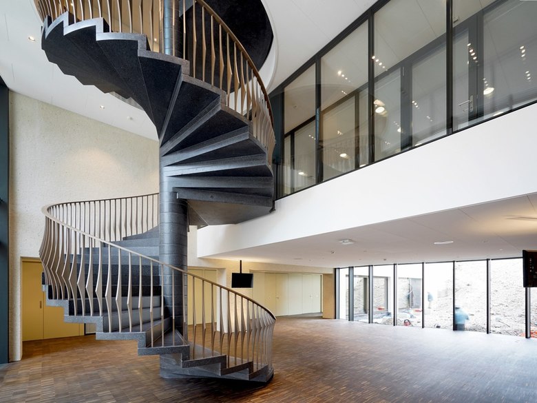 Zwischen zwei versetzt angeordneten oberirdischen Gebäudevolumen taucht das Terrain in die Tiefe und bildet zwei Innenhöfe. Im Inneren führt eine grosszügige, gewendelte Treppe über einen teilweise zweigeschossigen Hallenbereich in die Tiefe. Die geräumigen Wertebereichen am Licht erleichtern den Patienten den Aufenthalt im Gebäude und ermöglichen dem hochspezialisierten Personal eine angenehme Arbeitsatmosphäre auch im Untergeschoss. Die hochtechnisierten medizinischen Einrichtung wurde mit einer warmen, gepflegte Materialwahl kombiniert, ohne die Technik in den Vordergrund zu stellen. Das Wohlbefinden der Patienten und des Personals stand im Zentrum des Entwurfsgedankens.