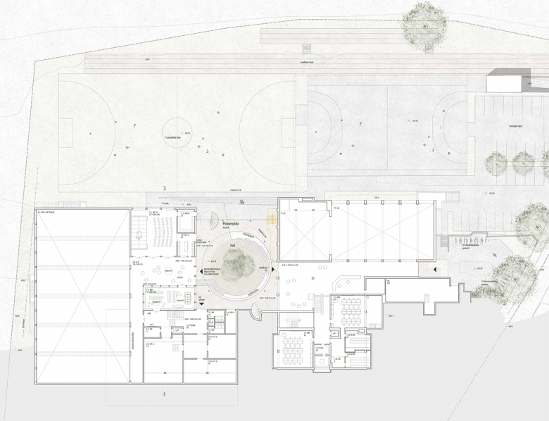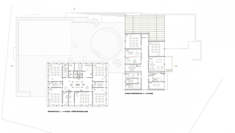 Die Erweiterung dehnt das vorhandene Hallendach mit Schulhof zum grossflächigen „Schul-Plateau“ in die Landschaft aus, aus dem heraus altes und neues Schulhaus aufragen. Der künstliche Sockel nimmt mit den Sporthallen, Foyers und Zuschauerbereichen, Mehrzwecksaal und Bibliothek die öffentlichen Nutzungen auf und verbindet Alt- und Neubau über einen zentralen Hof auf Ebene UG1. Sein grosser, kreisrunder Deckenausschnitt verbindet ihn mit der Erdgeschoss-Ebene des nun über beide Gebäudeteile hinweg erweiterten Schulhofs mit Allwetterplatz auf dem Dach der neuen Turnhalle. Oberhalb des befestigen Pausenplatz-Horizonts stehen das alte Schulhaus der 5. + 6. Klassen und das neue Schulhaus mit den Kindergärten im EG und den Primarschulklassen 1 - 4 im OG als eigenständige Gebäude nebeneinander, umgeben von den umlaufend ausgestalteten Pausenplatz- und Grünanlagen der Schulnutzung.