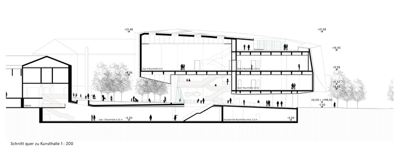 Zentraler Gedanke ist, das Erdgeschoß als offene Zone mit Wegen, Plätzen und Infrastruktur zu gestalten, sodass das Museum im EG des Hauptgebäudes ohne Ticket als Durchgang genutzt werden kann. So wird der Besucherstrom direkt von der Donau und von den umgebenden Straßen über mehrere Eingänge ins Museum geführt.