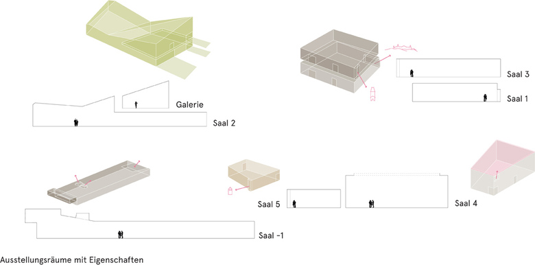 Jedem der angebundenen Museen wird eine eigene räumliche Erschließungsrichtung zugewiesen, die der Hauptausrichtung des jeweiligen Gebäudes entspricht - dies unterstützt die Identität und erleichtert die Orientierung. Zentrales Erschließungselement der neuen Ausstellungsräume ist die direkt neben Kassa und Shop beginnende und von allen Seiten sichtbare Treppe, die sich mit mehreren Richtungsänderungen und unterschiedlich langen Stiegenläufen nach oben schraubt. Der Blick ins Foyer zur Orientierung ist dabei immer wieder möglich. Es sind alle Säle entlang dieses abwechslungsreichen Weges angeordnet und können nacheinander besichtigt werden.