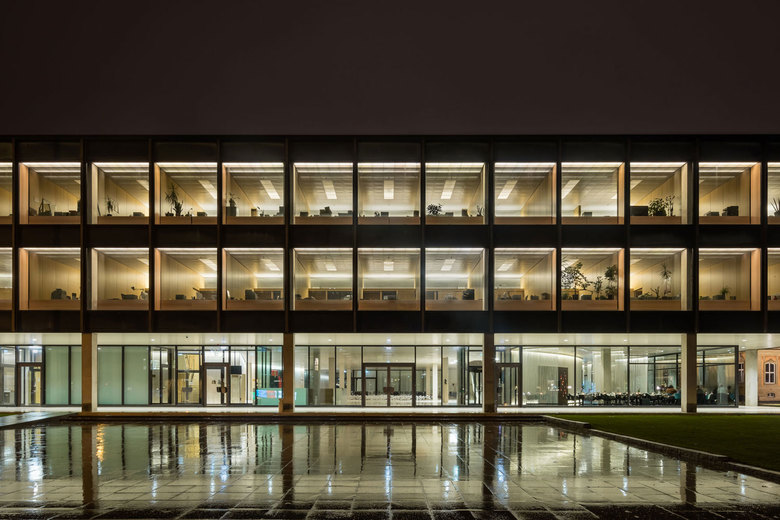 Um einen wirksamen Sonnenschutz zu erreichen, ohne die Anmutung der Fassade von außen zu verändern, erhielten die Bürospangen eine zweite innenliegende Glasfassade, die über Jalousien im Fassadenzwischenraum verschattet werden kann.