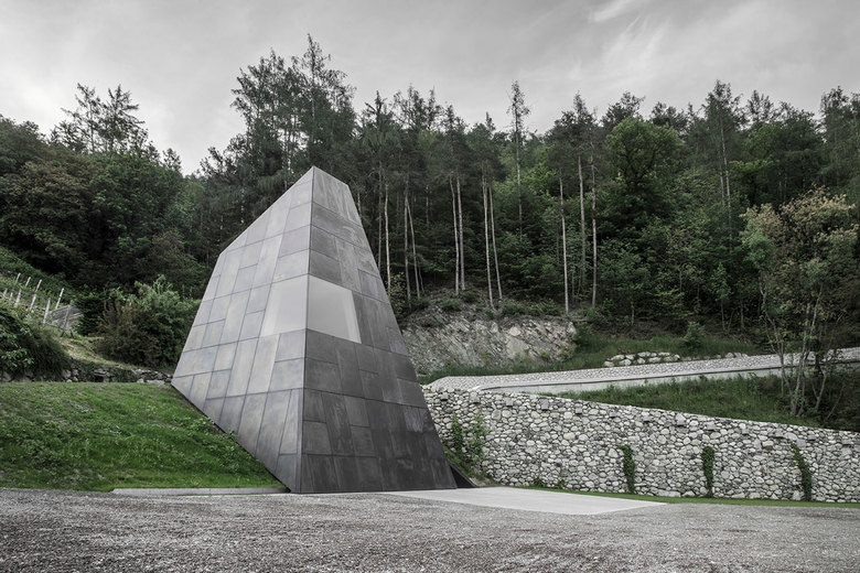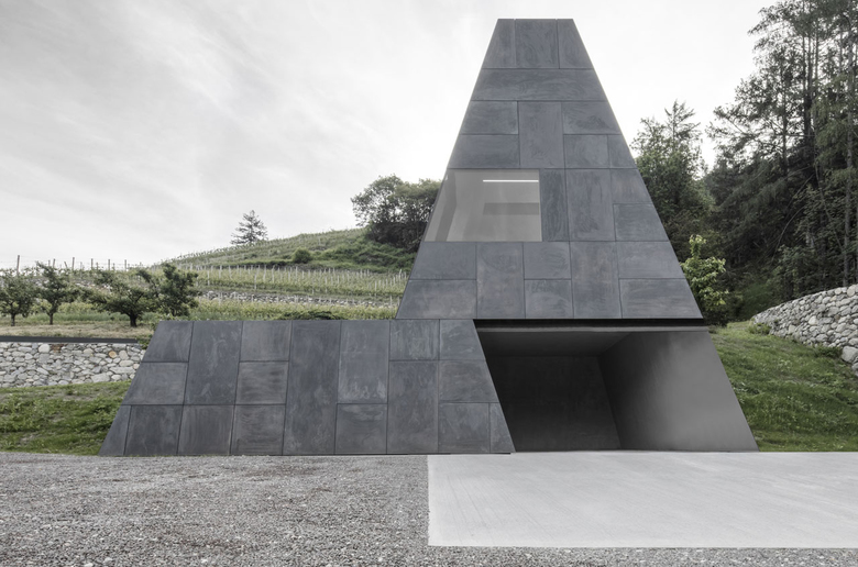 andockend an den bestehenden, historischen säulenkeller aus dem jahre 1450, mit einem treppentunnel verbunden, entsteht in einer art verlängerung der neue trapezförmige keller. die neuen kellerräume dienen der weinproduktion, in der sich die edelstahltanks und die grobe weiße körnung des putzes, von wand und decke, in eine art materialspiel vermischen. eine verfremdung in der reflexion. am ende erwächst aus dem keller ein trichterförmiger, polygonaler turm aus bronze und wird teil der landschaft. er beinhaltet einerseits den technischen ablauf der ernte und andererseits die kommunikationsebene mit blick in die reblandschaft. der historische keller gepaart mit dem neuen ist teil eines parcours, der in die geschichte bzw. der eingang zum keller ist durch eine betonwand gekennzeichnet, die zwei funktionen hat: einerseits dient sie dazu, den besucher zum parkplatz zu leiten, andererseits begleitet sie die rampe, die zum neuen keller führt.in das neue der kellerei pacherhof führt. eine zeitreise in die tradition, sei es beim arbeiten, von eichenfässern bis hin zu edelstahltanks, sei es in der architektur, von gewölben in verbindung mit zeitlosem. ein spiel von natürlichem und künstlichem licht und von materialität.