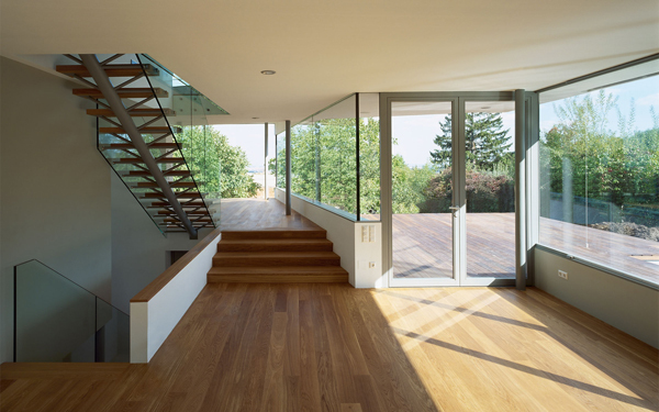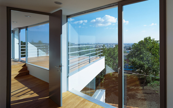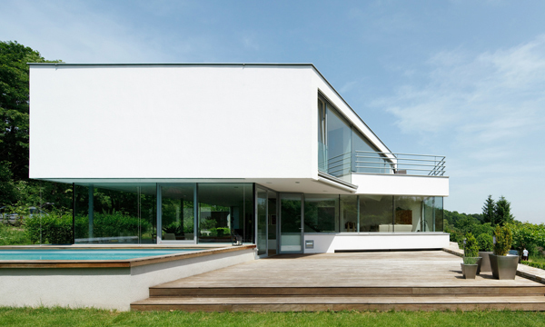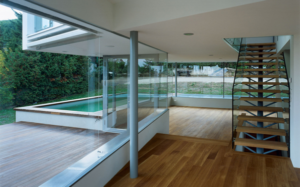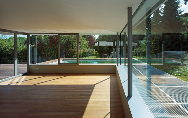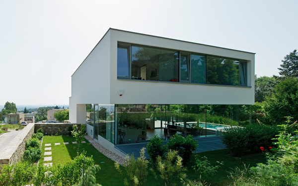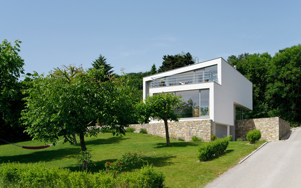 Dieses Haus ist Teil einer aus einer Privatinitiative entstandenen Gartensiedlungsanlage, die am Rande des Lainzer Tiergartens mit Blick über Wien gelegen ist. Der Anlage liegt ein Masterplan von 3:0 Landschaftsarchitektur und non:conform zugrunde. Ziel des Materplans war es einerseits, mit einem Set von „Spielregeln“ ein Minimum gegenseitiger Beeinträchtigung bei Ausblick und Besonnung für die individuellen Häuser zu erreichen. Andererseits sollte ein gemeinsamer Materialkanon für alle Elemente der Außenanlagen der öffentlichen und halböffentlichen Bereiche der Häuser entwickelt werden. So würde eine Siedlung völlig individueller Häuser entstehen, die jedoch in ihren Sockelzonen und Vorgartenbereichen eine gemeinsame Sprache sprechen würden. Da das von uns entworfene Haus als erstes fertig gestellt wurde, kam uns eine gewisse Pionierrolle innerhalb der Siedlung zu, weil die von uns getroffene Materialwahl maßgeblich für die ganze Siedlung werden würde – zumindest war dies so vereinbart. Befestigte Bereiche zur Privatstraße hin werden in Betonpflaster mit Besenstrich ausgeführt. Die Siedlung wird frei von Zäunen und Einfriedungen sein. Lediglich Stützmauern aus Natursteintrockenmauerwerk zonieren die Anlage, stellen jedoch auch im Sinne des Naturschutzes keine Barrieren für Flora und Fauna dar. Die Trockenmauern aus Waldviertler Granulit bewältigen die verschiedenen Geländeniveaus unseres Hauses, formen aber zugleich einen markanten Sockel, der aus der Landschaft wächst und über dem, abgesetzt durch ein nahezu allseitig verglastes Erdgeschoß, das Gebäude auf extrem schlanken Stahlstützen zu schweben scheint. Das Erdgeschoß beinhaltet ein Raumkontinuum, das über eine zweigeschossige, kleine Eingangshalle erschlossen wird und eine Wohnküche, einen Essplatz und – etwas höher gelegen und über eine Stufenrampe erreichbar – einen Wohnbereich enthält. Dieses höhere Niveau bildet einen zweiten Horizont, der die Parapethöhen des tieferen Bereichs definiert und durch die spiegelnde Wasserfläche des vorgelagerten Pools akzentuiert wird. Der tiefere Bereich – mit Wohnküche und Essplatz – ist in das Gelände eingegraben, während der Wohnbereich bereits von der weiß verputzten Hüllfigur aufgenommen wird, die im Obergeschoß die privaten Raumbereiche enthält. Dort endet der Weg durch das Haus auf einer kleinen Terrasse, die wiederum über ein paar Stufen erreichbar ist und einen phantastischen Ausblick über ganz Wien bietet.