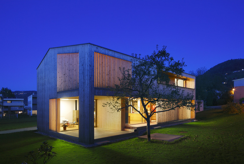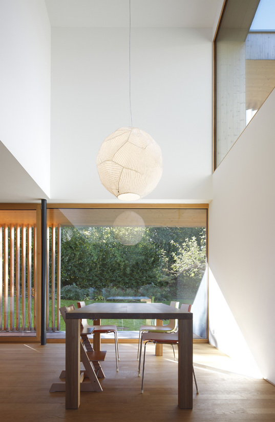 Ein Raumkontinuum um die zentrale Lehmwand verbindet über einen großzügigen Luftraum die beiden Geschoße vertikal. Filterelemente aus Holz und Textil sowie bewusst gesetzte Aus- und Durchblicke lassen ein differenziertes Spektrum an atmosphärischer Durchlässigkeit und räumlicher Intimität entstehen. Vorgelagerte Terrassen schützen vor sommerlicher Hitze und erweitern den Innenraum über großzügige Verglasungen in den offenen Gartenbereich. Ein fächerartig umschlossener Terrassenhof ermöglicht im Obergeschoß einen sichtgeschützten Aufenthalt unter freiem Himmel und bringt das Winterlicht tief in das Haus.