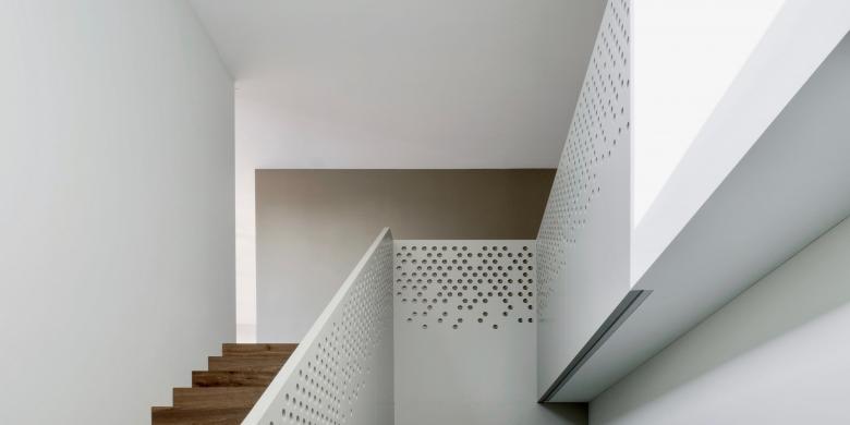 Die Umgebung der Gartenwohnung wird durch eine mit Kalksteinbeton gefertigte Mauer gefasst welche den Aussenraum zur Quartierstrasse schliesst. Im Obergeschoss besetzt die Dachwohnung mit den grosszügigen Terrassen die gesamte Geschossfläche. Die Grundrisse beider Wohnungen entwickeln sich um die zentralen Nasszellen.