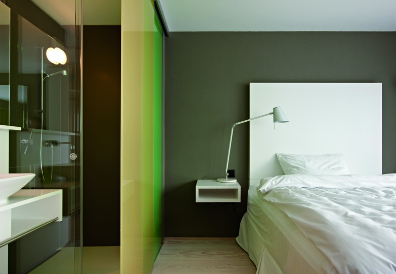 Hotel Rössli Möglichst viel angenehme Raumatmosphäre, „ weniger ist mehr“ in hoher handwerklicher Qualität war unsere Vision. Denn für uns war klar: Raum ist der Luxus, den das Rössli bieten kann! Eyecatcher in den unterschiedlichen Zimmern sind nebst den grossen Spiegeln die farbigen Gläser als variable Trennwände zwischen Schlaf- und Badezimmer, das exklusive Bett sowie die geseifte Douglasie (Fichte) als Bodenbelag. Er ist eine Hommage an die schöne Bergwelt in der Umgebung. Für den Gast nicht erkennbar, aber für uns eine sehr zentrale Fragestellung war: Wie können wir das Haus für einen sparsamen Umgang mit Heizenergie vorbereiten? Der Entscheid, die ungünstigen Balkone abzureissen, erwies sich als optimal. Die Fassade wurde gut eingepackt und die Öl- durch eine Wärmetauscher-Heizung ersetzt.