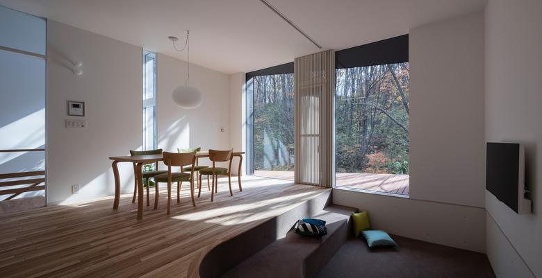 A house built on the mountainside near the center of Sapporo. Although the site is located in a residential area, hardwood forests are left on the slope along the creek behind. Since the site was vacant for long time, the neighborhood residents were able to see the rich forests spreading along the creek every time they took a walk. In this plan, to prevent the view from being taken away from the neighborhood, a flat single-storied house is built on the inclined site, to keep the sight available through underneath the building. This space can be used for many purposes throughout the seasons not only as an eaves in front of the entrance but also as a semi-outdoor place, such as a parking space or work space in front of the shed, even during the winter in Sapporo with many snow.