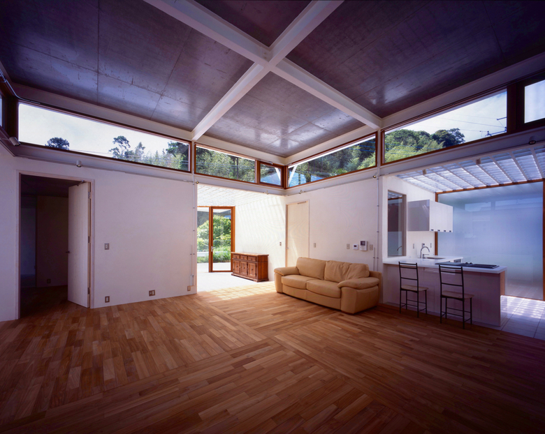 東西に長い約200坪の敷地は、北側以外は隣接した建物もなく、また四方に十分な余白を確保できることから、閉じる必要がないように思えたが、検討を重ねた結果、きちんと閉じなければきれいに開くことはできないという結論に達した。