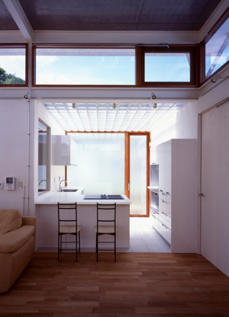 光が絞り込まれる4つの個室、トップサイドライトから光が回る家族室、ガラスブロックの屋根がかかった4つの外部的な内部空間というヒエラルキーは、個から家族、そして街へと開いていくことを意図している。