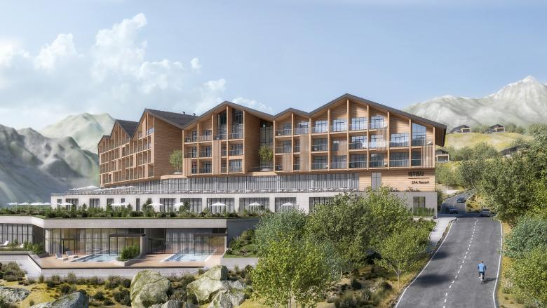 The entire masterplan follows an organic design that aims to build the new resort in harmony with nature and existing places. The organic and naturalistic approach was also adopted in the design of the main building, the hotel: the profile of the hotel recalls the shape of the mountain with a deliberately asymmetrical and iconic design.