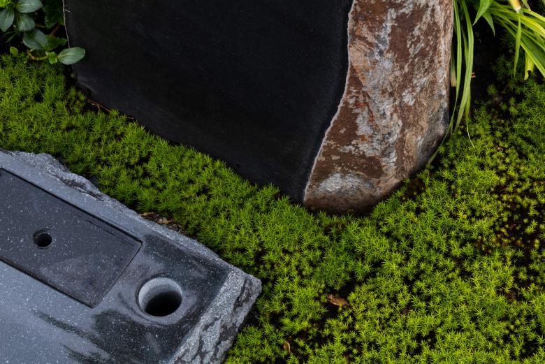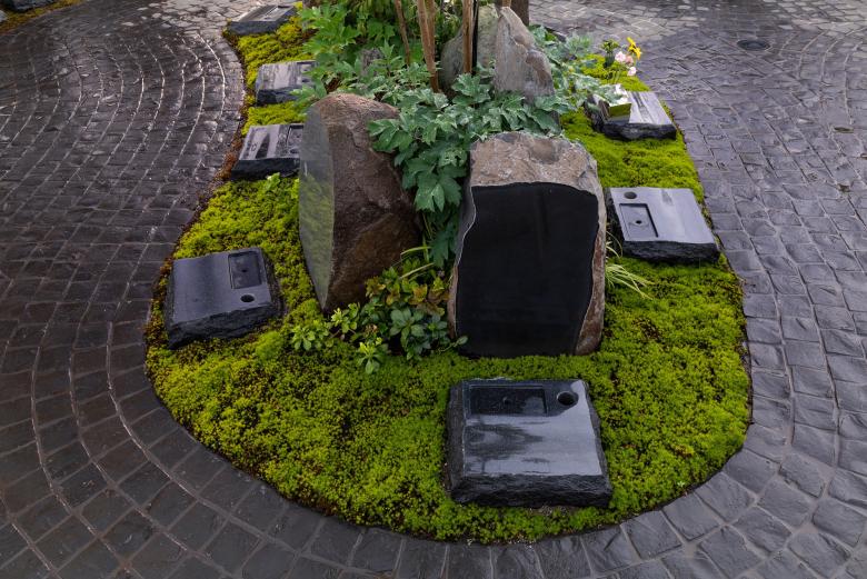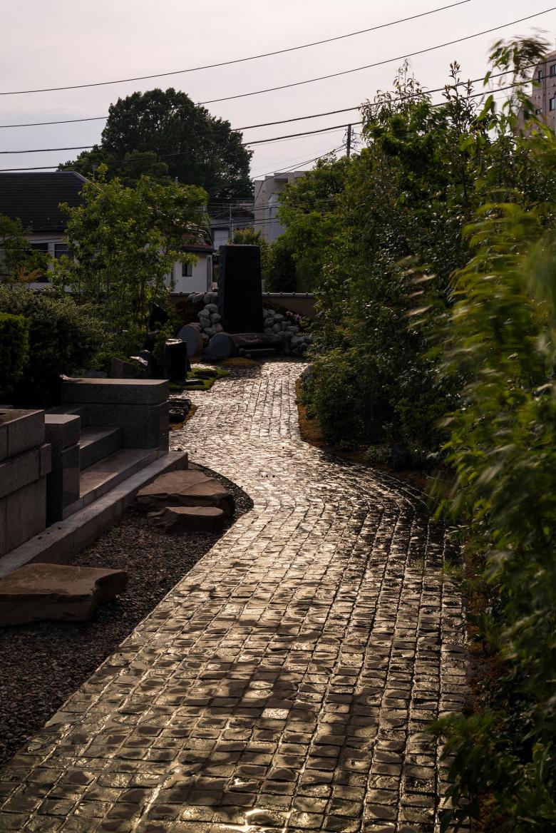 2つの築山状合祀墓が敷地外の桜並木の2本の桜に正確に向き、そこを起点にして周縁部の5つの築山状合祀墓の位置が自ずと決まる。個別墓のみで構成された苔庭面積は、中央に樹木を2~3本配置出来る最小限とすれば、その大きさと数は自ずと決まる。築山に近い部分の苔庭の形は、築山との間に2人がすれ違える幅員1.2Mの参道を通す事で自ずと決まる。残りの苔庭の形とその配置は、ある参道の正面に必ず別の苔庭があり、参道が次々と分岐するように決める。こうして各苔庭は分岐する参道と隣合う苔庭の影響により決められるので、1つとして同じ形はない。ピンコロによる参道舗装は枯山水の砂紋を模していて、各苔庭を中心に波紋のように広がり、互いに打ち消しあう。有機的なデザインは数学的思考の結果であり、参拝者は遠くの山々を借景にした枯山水の中を散策しているような豊かなシークエンスを経験する。