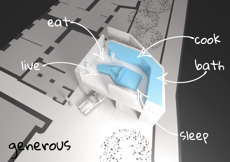 100 Jahre später fusionieren wir Essen, Schlafen und Wohnen in eine zentrale Wohninsel. Das Bad, Küche und Stauraum werden in einer Wandaufdoppelung untergebracht und minimal gehalten. So kann aus einer kleinen Fläche ein großer Raum werden!