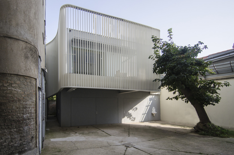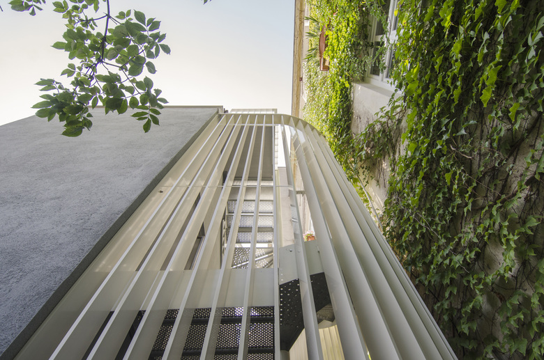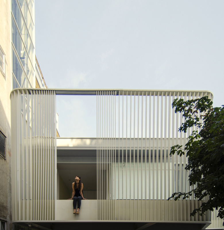 Draußen schrauben wir eine Terrasse auf das Haus und hüllen diese in ein elegantes Lamellenkleid. Der so gewonnene Außenraum verdoppelt das nur 35m² Einraumapartment zu einer in sich gekehrten Rückzugsoase. Die Lamellen halten neugierige Blicke draußen und orientieren Außenraum nach innen, sie schmiegen und umarmen die Wendeltreppe die zum Eingang und auf eine Dachterrasse führt. Dort genießt man einen unvergleichlichen Blick auf die Museen – alt wie neu.