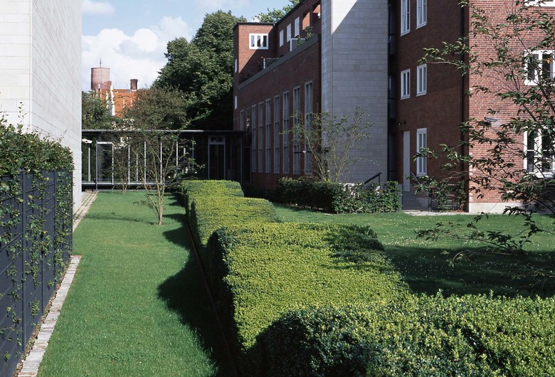Gleichzeitig sollte die Trennung der beiden Bankgebäude unterstrichen werden, um der Forderung der Stadt zu entsprechen, eine Blickachse auf die Lübecker Kirchen freizuhalten. Die gepflanzte Buchsbaumhecke betont die Blickachse auf die Stadt und hält ein Sichtfeld auf die Türme frei. Gleichzeitig bildet sie eine imaginäre Sicherheitsbarriere für den Tresorbaukörper. Für diesen Gartenraum wurden keine großen Aufwendungen unternommen. Verschiedene Heckenarten - Eibe, Rotbuche und Buchsbaum - rahmen und gliedern diesen Ort. Die Verfasser sind der Meinung, dass gerade ein öffentlicher Bauherr gemeinsam mit seinem Landschaftsarchitekten für einen in der Bundesrepublik einmaligen Ort eine einmalige Lösung schaffen muss.