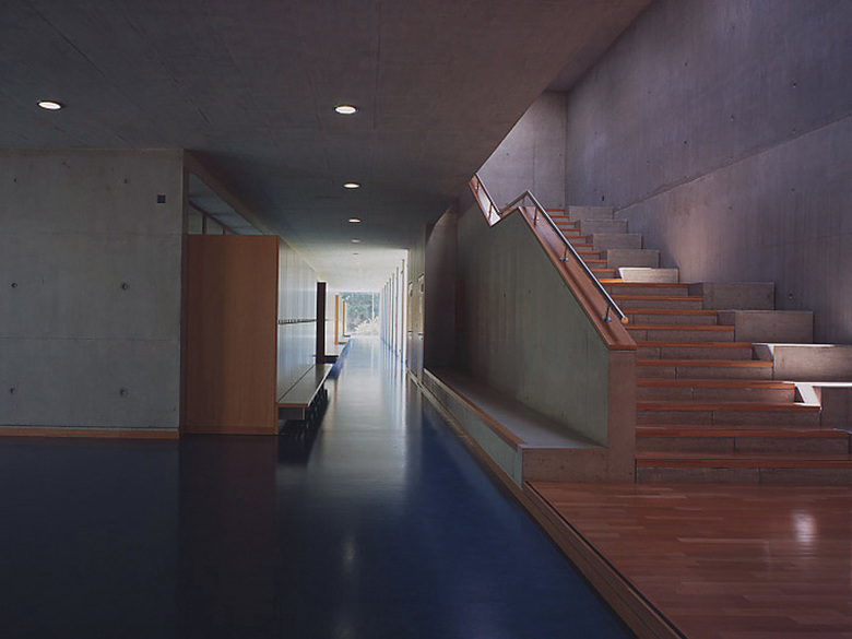 Le collège est constitué d’un système porteur lamellaire en béton définissant chacun des espaces de classes et d’une façade vitrée périphérique. La séparation classes – couloirs s’affirme à travers un élément non porteur constitué d’armoires et de hauts-jours en hêtre naturel. Les revêtements de plafonds des classes sont eux aussi traités dans la même essence. L’ensemble des sols est unifié par un linoléum de couleur bleue.