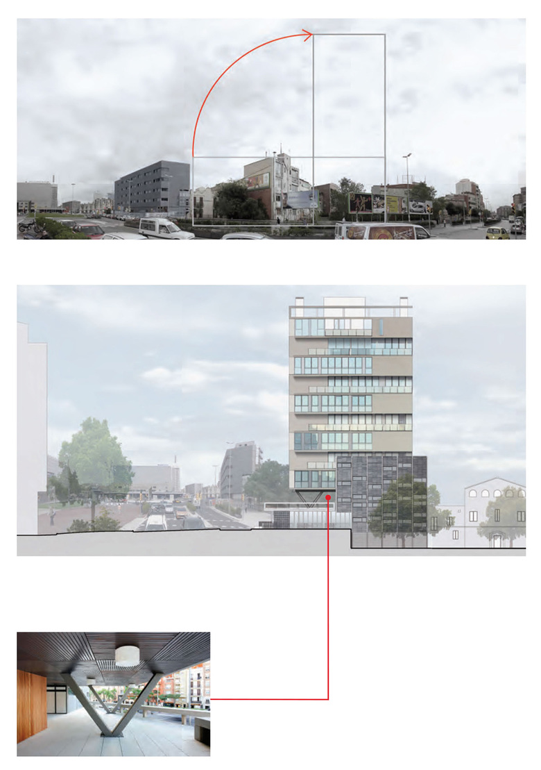 Situé à la limite du vieux quartier historique de Sants, composé d´un tissu de petites rues et de bâtiments de cinq étages, et du Paseo Sant Antoni, avenue de50 mètres de large, ce bâtiment établit une couture urbaine entre ce quartier et la grande avenue. Tout en restructurant l’espace public au niveau zéro, il dégage des accès piétons, pour compenser un dénivelé d’environ trois mètres de hauteur entre le boulevard et les rues étroites du tissu urbain du vieux quartier. D’autre part, à proximité de la gare centrale de Sants, il bénéficie d’un emplacement stratégique et crée un phare dans le paysage urbain. La réglementation du PLU préconisait un bâtiment linéaire de 70 m, le long du boulevard. Notre projet le redresse et le transforme en une tour de dix étages, de plan carré, dégageant au niveau zéro, une rampe, un escalier et une place de quartier. Il a fait l’objet d’une dérogation au Plan d’urbanisme, accordée par la Commission de Qualité de la Mairie de Barcelone. En façade, un pli allant du deuxième au dernier étage crée des espaces extérieurs pour tous les appartements et sert également de protection solaire passive. L’immeuble repose sur un premier étage sur pilotis, terrasse commune couverte et espace de rencontre pour les résidents. En rez-de-chaussée, se trouve un local commercial.